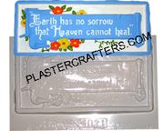 This flexible plaster crafting mold produces approximately 11" wide by approximately 5.25" tall religious themed plaques. The words "EARTH HAS NO SORROW THAT HEAVEN CANNOT HEAL" are inscribed on the front of the plaque.